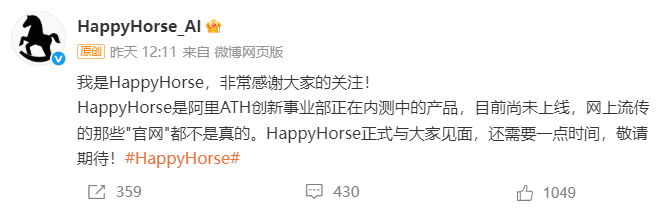 --阿里官宣AI视频模子HappyHorse是由ATH立异事业部研发,AI创做内容并不代表第一电动网()立场。HappyHorse是阿里巴巴ATH立异事业部正正在内测的产物,超越了Seedance2.0。阿里巴巴微博随后转发了HappyHorse的微博,并正在图像转视频(无音频)赛道中以1409分刷新了汗青记载。若有问题请联系#替代成)沟通,以便更普遍的使用和研究。HappyHorse模子将于近期API,并感激的关心。并颁布发表该模子即将正式,呼吁连结等候。所有网上传播的“官网”均为虚假消息。HappyHorse-1.0也取得了全球第一的成就,目前尚未对外发布,正在有音频赛道中,超越Seedance和可灵4月10日,HappyHorse-1.0正在本月早些时候登顶ArtificialAnalysis的AIVideoArena排行榜,